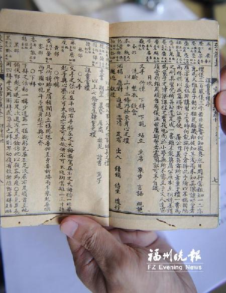 竹头寨的精美木雕。 四六分配的耕读“潜规则” “耕者十之六,读者十之四,这讲的就是当时竹头寨黄氏耕读家风的潜规则。”80岁的黄修朗如今仍致力于白云乡历史文化的研究。他告诉记者,当时,村民的生计主要依靠农耕畜牧,却极其重视读书教育,并认为这是子孙走出深山,出人头地的机会。为了让两者兼顾,先人除了立下“读者”和“耕者”按四六比例的分配外,还规定在农忙时读者必须参与耕作,农闲时耕者也得跟着一起读书。 黄修朗老人说,对于耕读家风氛围的营造,先人有意识从娃娃抓起。针对学龄前的孩童,父母会领着他们在自家祭祀的孔夫子像前,早晚焚香礼拜,并背诵《圣人经》。同时,每个孩童几乎人手一本《课童常礼序》,里面归纳总结了包括衣食住行、言语视听、作揖下拜等28条规范。“那时候,逢祭祀、扫墓,长辈们免不了让孩子们背《圣人经》。”黄修朗老人说,此外,学好《五言杂字》、珠算、写条据是当时耕读的最低要求。再进一层,就要学《三字经》《弟子规》《百家姓》《千字文》等等,对于学子习武学医,甚至出国深造,家族都非常鼓励。 在诸多的黄氏莘莘学子中,也出了一些在学术中颇有成就的人物。如明末的黄文焕乃一代经学大师,通经史,著作甚多。历任番禺、海阳、山阳县令,招剿海盗,安置流民,清理漕运有功,后任翰林院编修、左春坊左中允、内阁学士;清初杰出的诗人黄任,诗书自成一家,其《杭州西湖》绝句14首,被清乾隆皇帝称为“闽之瑰宝”;清朝中期的黄图南,曾是同治皇帝的启蒙老师,历任翰林侍讲,学问、道德俱佳,后来被钦命为贵州提督学政。