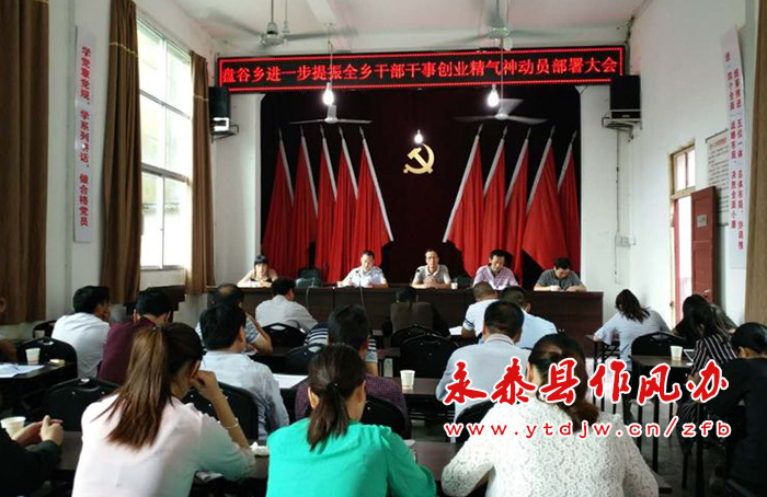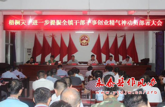 梧桐镇 10月9日晚,梧桐镇召开关于进一步提振全镇干部干事创业精气神动员部署会,党委书记黄绍川传达了全县提振干部干事创业精气神动员大会精神,并提出五个方面要求:一要提振干部精气神,敢于迎难而上。面对当前的工作,干部们要有自强、自信、自立的精神;二要提振干部精气神,重于履职尽责。每个干部都身负职责,需要大家在工作中将压力层层传导、严格落实;三要提振干部精气神,善于提升本领。镇、村干部要不断地学习,不断提升本领,才能高效完成任务;四要提振干部精气神,勇于争创一流。镇、村干部要将当前的重点工作落实到位,对每一项工作都要有清晰的规划,争取做到最好;五要提振干部精气神,乐于团结协助。镇、村干部要相互配合协调,加强各部门间的联动配合,才能在工作中事半功倍。