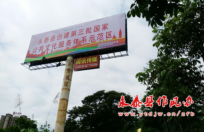 公共文化服务体系示范区创建高速宣传牌 强化舆论宣传,营造创建工作良好氛围。明确宣传工作具体措施。制定并下发了《永泰县创建国家公共文化服务体系示范区宣传工作实施方案》,要求各乡镇严格按照实施方案,狠抓落实;定期召集21个乡镇分管领导和综合文化站站长召开创建宣传工作培训会。通过多项举措进行宣传。形成县、乡、村三级协调联动宣传模式,以文艺汇演、设置标语、发放宣传单等形式进行广泛深入的宣传,努力营造全民了解创建、支持创建、参与创建的浓厚氛围。同时,为迎接文化部中期督查,进一步提高群众知晓率和满意度,由县创建办牵头,各乡镇配合,在全县公交站、高速公路旁、在建项目大型挡板以及城区街道、主要路口、广场、文化站等显眼位置悬挂横幅、设置广告;在全县公交车LED上滚动宣传示范区创建标语;在全县移动客服中普发示范区创建宣传标语和相关内容的短信20多万条。通过“永泰新闻网”“微永泰”“示范区创建微信群”等公共网络平台实时更新报道我县创建工作动态;制作宣传动漫短片和滚动宣传标语,结合市下发的宣传短片,在县电视台和各乡镇LED显示屏上长期播放。这些宣传举措,得到文化部督查组的较高评价。建立信息定期报送制度。及时整理收集我县创建工作经验、亮点和特色活动的相关信息,定期报送创建示范区进展情况。截止目前,共向市局上报250多条创建信息,被采用100多条。 城峰组团项目攻坚捷报频传。城峰组团项目攻坚组以学习贯彻十九大精神为动力,大力推动项目征迁。攻坚组人员发扬连续作战精神,主动放弃双休日休息,甚至利用晚上征迁户在家时间入户工作,谈感情,说协议,解疑难,促征迁。11月29日至12月2日,签约近4000平方米,创造了城峰单周签约新记录,先后完成温泉改造安置房、小汤山周边道路、南城区南环东路、城峰中心小学扩建等多个重点、堵点项目拆迁户的拆迁安置协议签订,为下一步快速推进项目攻坚打下基础。