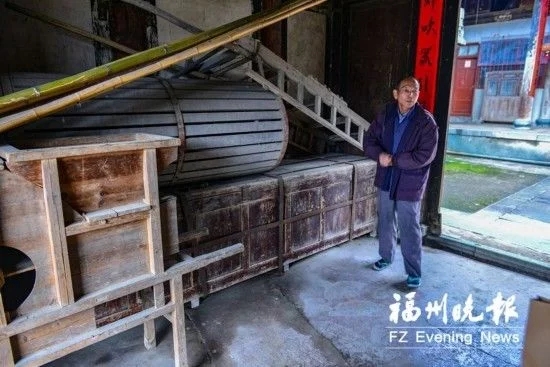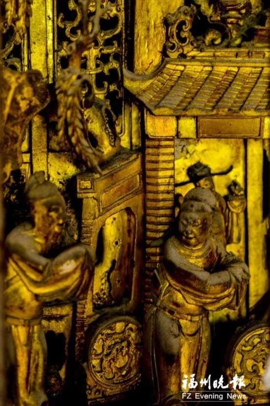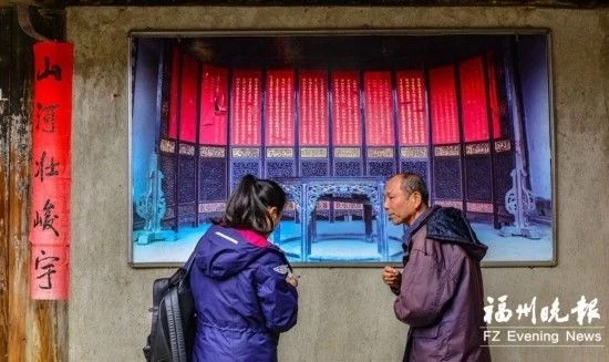 厝中还保存有许多镌刻精致的石楹联。 被觊觎百年的稀世珍宝 用坦厝的精彩故事可以从厝内那些被盗贼觊觎近百年的宝贝说起。 在用坦厝的第一道门内,侧放着一个硕大的红漆木箱。这个约有两米长的方形木箱,不仅锁得严实,上面还焊了数道铁条用以加固。如今正对着这个红漆大箱,还有一个监控摄像头,24小时摄录接近它的人。这个乡间民厝中的红漆大箱有什么奥秘?里面藏着的是什么宝贝? 村民陈致铣告诉记者,这红漆大箱里的东西当真可以说是“价值连城”,那是一组雕刻于乾隆年间的十二扇金丝楠木雕屏风,是这座大宅的起建者陈用坦六十大寿时收到的寿礼。屏风漆红鎏金,雕刻有花草虫鱼,而贺词则由当时的榜眼题写。有专家为它估值超过2000万元。几年前,央视曾有节目组来此,以用坦厝木雕屏风为引,为嵩口古镇拍摄了一辑纪录片《富居深山》。 作为用坦厝的第八代子孙,陈致铣不仅熟悉这组木雕屏风,还了解它在近百年中被觊觎、被偷盗并失而复得的历史。他说,解放前,屏风一度被盗并被运到了福州城里。陈家后人辗转寻得,付出了大量银元将之赎回。上世纪70年代,觊觎它的文物盗贼又出手了,这次行动因弄出了声响惊动住户,最终没有成功。为防止再次失窃,后人只好将它紧锁于木箱中,严加看守。 盗贼长年觊觎、数度“光临”,只因用坦厝富有的名声在外。厝里的泥塑壁画,称得上“窗如画卷,画作窗棂”。但这些宝贝,也因精美,屡遭盗窃。这几十年中,屏风虽然守住了,却有一对石柱础、主厅神龛上的两扇围屏相继被盗。 然而用坦厝还有一样“珍宝”,是盗贼和岁月都无法带走的,那就是它丰富的家训文化。这些有形无形的“珍宝”都由起建者陈用坦一手缔造。
