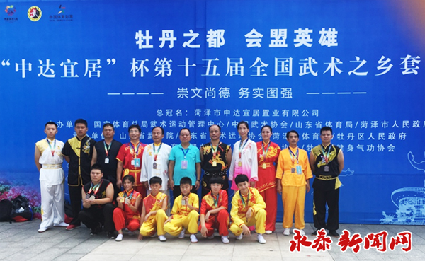 7月27日,为期三天的第十五届全国武术之乡武术套路比赛在牡丹之都——山东省菏泽市落下帷幕。本次比赛由国家体育总局武术运动管理中心、中国武术协会、山东省体育局、荷泽市人民政府主办,有来自全国各地的武术之乡100支代表队1360名运动员参加比赛。 我县代表队由领队、教练员、运动员等18人组成。参赛的项目有男子儿童组、少年组、青年组、中年组、老年组传统拳术和器械,女子儿童组、青年组、中年组传统拳术和器械。参赛的拳种有:虎尊拳、安海拳、鸡法拳、太极拳和传统器械棍术、扁担法、铁尺、太极剑等。 经过紧张激烈的争夺,永泰县代表队共获得6枚金牌、7枚银牌、14枚铜牌,在参赛的32个项目中共有27个项目获奖。林章营、施平分别夺得2枚金牌,许千艺、王飞雨各获1枚金牌,王金平获得武德风尚奖教练员荣誉称号,林章营、施平获得武德风尚奖运动员荣誉称号。本次比赛的运动员最小年龄10岁,最大年龄63岁。 近年来,永泰县着力擦亮“全国武术之乡”品牌,把武术工作纳入政府工作计划,每年组队参加至少2场大型武术交流比赛并获得佳绩。积极开展武术“六进”工作,推动全民习武健身,提高传统武艺,切实推进非物质文化遗产的“活态传承”。