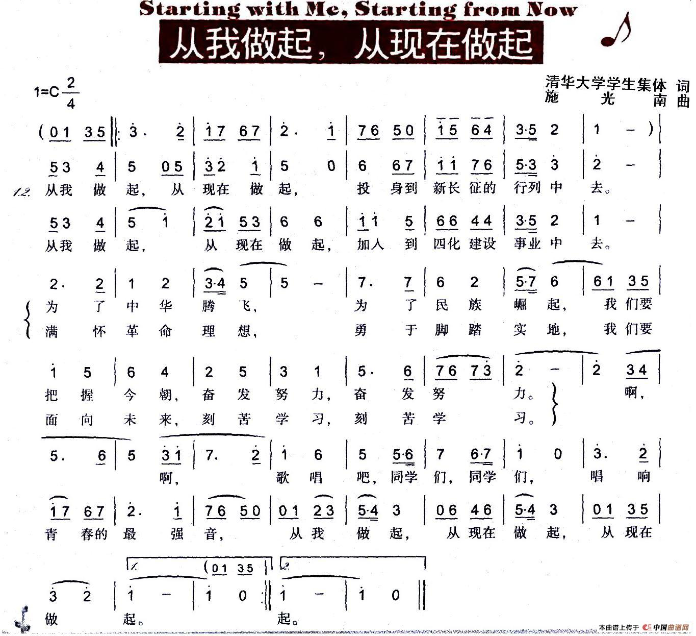 图为《从我做起,从现在做起》的曲谱。(来源:中国曲谱网) 新浪微博网友@愚人:“从我做起,从现在做起”这句口号是三十多年前从一个大学校园里传播出来的,时至今日,这句口号好像不那么流行了,许多人都已经把它忘记了——尽管如此,尽管它听起来不那么慷慨激昂,但是我仍然认为它是一个既科学又实际的口号。 搜狐网友名师:其实在日常生活中,有一些我们身边的事情还是可以参与的,比如说环保、节约、见义勇为、遵纪守法等等。在这些方面,我们每一个公民都是可以有所作为的。从我做起,从现在做起! 网易网友199672700:从我做起,从现在做起并不只是一句口号,还是一种人生态度。不去等待,而是把决心化为实际的行动。正如一句话所说:想成功,任何时候开始都不晚。 |
