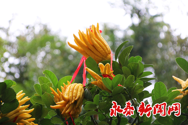 在天门山景区通往福州首条玻璃栈道的道路两侧,黄澄澄的佛手挂满枝头,形态似人的手指,有的做握拳状有的做伸直状,不时飘出阵阵柑橘清香,吸引不少游客驻足观赏拍照。