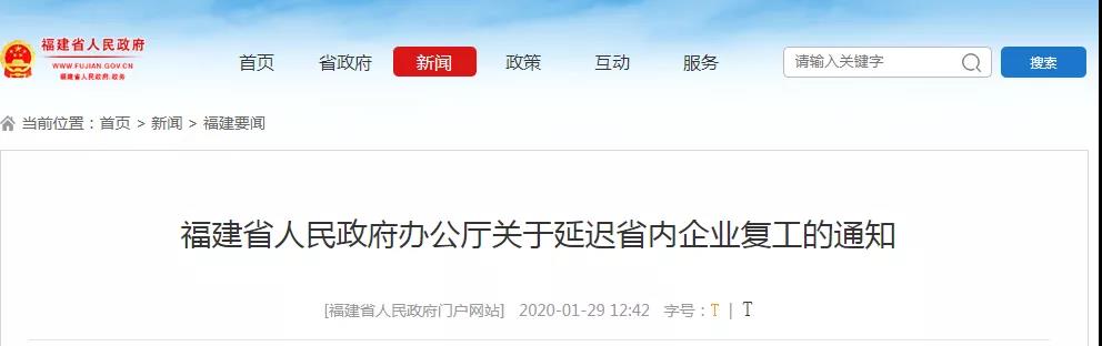 各市、县(区)人民政府,平潭综合实验区管委会,省人民政府各部门、各直属机构,各大企业,各高等院校:为加强新型冠状病毒感染的肺炎疫情防控工作,有效减少人员聚集,阻断疫情传播,更好保障人民群众生命安全和身体健康,按照党中央、国务院防控工作部署,根据《中华人民共和国突发事件应对法》《中华人民共和国传染病防治法》和重大突发公共卫生事件一级响应机制的有关规定,经省委、省政府研究决定,现就延迟省内企业复工紧急通知如下: 一、省内企业已开工的继续稳产,减少工人流动。除涉及保障城市运行必需(供水、供气、供电、通讯等行业)、疫情防控必需(医疗器械、药品、防护品生产和销售等行业)、群众生活必需(超市卖场、食品生产和供应等行业)及其它涉及重要国计民生的相关企业稳定生产、做好服务保障外,其他企业要根据自身情况不早于2月9日(农历正月十六,星期日)24时前复工。用人单位须依法保障员工合法权益。 二、对确因工作需要近期返工的人员,各相关部门和所在单位要加强健康管理。铁路、民航、公路、水路等相关部门及县(市、区)政府要逐一对省外返工人员进行体温检测,并预设置隔离区。所在单位要及时报告相关信息,逐一掌握来自或去过疫情重点地区的人员情况,密切跟踪,及时应对,做到全覆盖。 三、各地要根据各企业员工来源地情况分轻重缓急错峰安排企业开工,县(市、区)政府要专门研究定出原则向上一级政府报备。各相关企业要切实落实本通知要求,强化主体责任,省外返工人员到岗即为每位员工建立健康档案,严格落实每日动态登记制度,采取用人单位工作人员询问和个人主动报告相结合,按照国家卫生健康委印发的疫情防控相关技术规范和指南要求及时掌握员工健康信息,如有发现疫情及时向属地卫生防疫主管部门报告,立即采取相关隔离治疗措施,并对密切接触者进行医学观察;省外员工全部到岗14天后无相关症状,企业内也无相关疫情病例和疑似病例,方可对员工恢复正常管理,确保把各项防控和服务保障措施落实落细,确保社会平稳有序 福建省人民政府办公厅 2020年1月29日 |