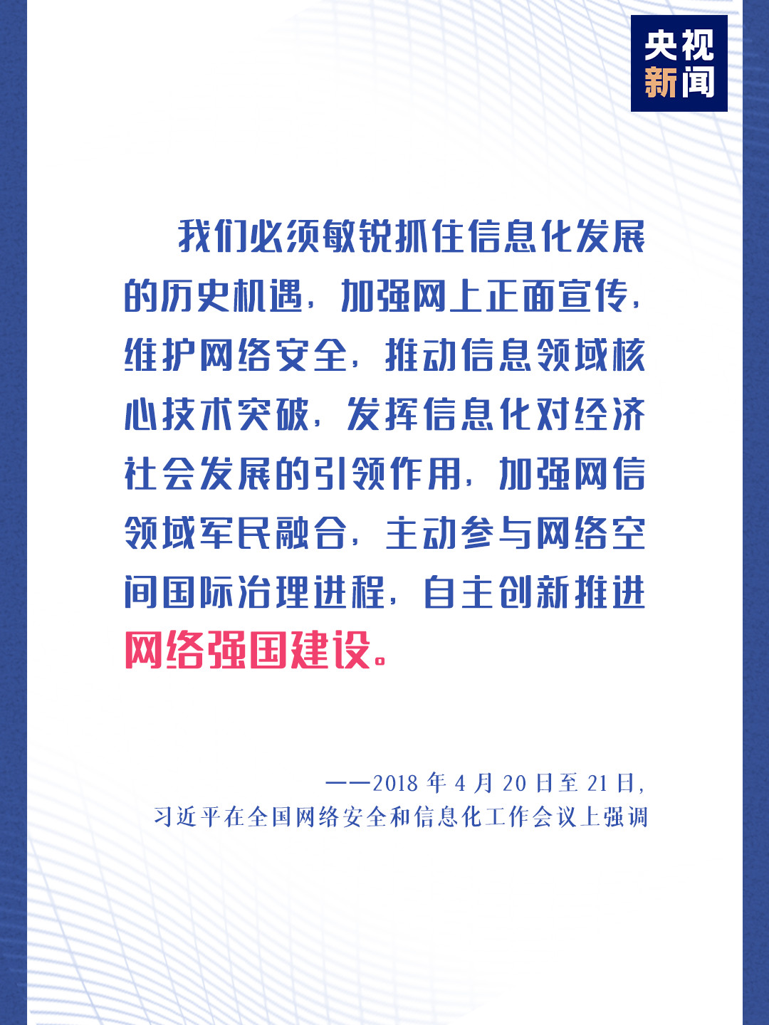 四年前的4月19日,习近平总书记主持召开网络安全和信息化工作座谈会并发表重要讲话。 △2016年4月19日,中共中央总书记、国家主席、中央军委主席、中央网络安全和信息化领导小组组长习近平在北京主持召开网络安全和信息化工作座谈会并发表重要讲话。 习近平总书记“4·19”重要讲话回答了我国互联网事业“为了谁发展”“实现什么发展目的”“怎么发展”和“如何发展好”等几个关键问题,高屋建瓴地提出了我国网信事业发展的总体框架。 从建设网络良好生态,到论及网络安全;从尽快在核心技术上取得突破,到为网信事业发展提供有力人才支撑;从加快网络立法进程,完善依法监管措施,到增强互联网企业使命感、责任感……总书记对每一个宏大主题均有涉及,均有精彩阐释,也均有方向性指导。 党的十八大以来,党中央重视互联网、发展互联网、治理互联网,统筹协调涉及政治、经济、文化、社会、军事等领域信息化和网络安全重大问题,作出一系列重大决策、提出一系列重大举措。 2013年11月,党的十八届三中全会通过的《中共中央关于全面深化改革若干重大问题的决定》提出,坚持积极利用、科学发展、依法管理、确保安全的方针,加大依法管理网络力度,加快完善互联网管理领导体制,确保国家网络和信息安全。 2014年2月27日,中央网络安全和信息化领导小组第一次会议召开时,习近平总书记强调,网络安全和信息化是事关国家安全和国家发展、事关广大人民群众工作生活的重大战略问题,要从国际国内大势出发,总体布局,统筹各方,创新发展,努力把我国建设成为网络强国。 2017年6月1日,《中华人民共和国网络安全法》正式施行,将网络安全各项工作带入法治化轨道。 党的十九大提出要建设网络强国、数字中国、智慧社会。《深化党和国家机构改革方案》将中央网络安全和信息化领导小组改为中央网络安全和信息化委员会…… 2018年4月20日至21日,习近平出席全国网络安全和信息化工作会议并发表重要讲话。 这是继“4·19”重要讲话后,全面阐述我国网络强国战略思想的一个重要讲话。习近平总书记在这次会上强调,我们不断推进理论创新和实践创新,不仅走出一条中国特色治网之道,而且提出一系列新思想新观点新论断,形成了网络强国战略思想。 截至2019年6月,中国网民规模为8.54亿人,互联网普及率为61.2%。光纤接入用户规模达3.96亿户,居全球首位。建设网络强国,是中国互联网发展的核心词汇。 在此次全国疫情防控和复工复产中,互联网发挥了重要作用。 特殊时期“停课不停学”。2月17日,国家中小学网络云平台正式开通,全国近1.8亿中小学生在家上课。过亿上班族在家办公。“云办公”“云会议”“云面试”等成为人们工作的新常态。“云商业”“云服务”便利社会生活。今年1-2月,全国实物商品网上零售额同比增长3%。 3月31日,习近平总书记在杭州城市大脑运营指挥中心考察时指出,要加快建设智慧城市。 杭州在今年2月11日上线的“健康码”就是“城市大脑”的重要产物。“健康码”实施“绿码、红码、黄码”三色动态管理,绿码者凭码通行,红码、黄码者需按规定隔离并健康打卡,满足条件后转为绿码。“健康码”在全国陆续推广并互通互认。到3月中旬,全国绝大部分地区“健康码”已可实现“一码通行”。 △杭州“健康码”上线首日访问量就达到1000万。 受疫情影响,湖北一些农副产品面临产销积压。央视新闻“谢谢你为湖北拼单”公益行动开播带货直播。4月6日与12日的两场直播,分别卖出价值4014万元和6100万元的湖北产品,助力湖北复工复产。 习近平总书记在“4·19”重要讲话中强调,网信事业要发展,必须贯彻以人民为中心的发展思想。让我们凝聚全社会共同努力,筑起网络安全防线,令亿万人民群众在网络空间拥有更多获得感、幸福感、安全感。 |