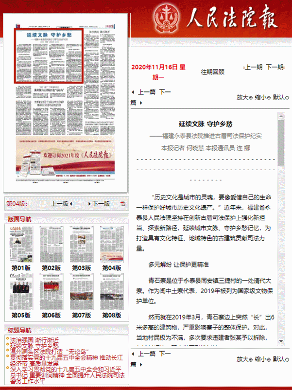 11月16日,《人民法院报》刊发《延续文脉 守护乡愁——福建永泰县法院推进古厝司法保护纪实》,点赞永泰法院古厝司法保护工作。现对全文予以转载。
