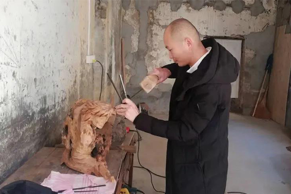 馆内展出的木雕作品以人物形象为主,有持刀的关羽,有手握金箍棒的孙悟空,还有手拿龙胆枪的赵云......各个人物神情雕琢得细腻生动,可谓形神俱佳,极具艺术风格。 工作室的主人公——陈君耀,是嵩口镇的一位返乡创业乡贤,从事木雕行业已有24年,2020年在其表哥郑忠水的召唤下,他放弃在广西已经营稳定的木雕厂,将这门技艺带回家乡,并发扬光大。