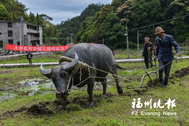 在“惜字坛”上,主祭人宣读疏文。 一条古官道 关联的名人与文化 辅弼岭这条古官道东起于三捷村双溪自然村,西止于三漈头,全长约3.5公里,“惜字坛”则位于古官道的中段。 今年的祭字纸仪式尤盛于往年。古道、古诗词与古仪式在这里发生了特殊的关联。 来自三捷小学的孩子们穿着整齐的校服,在古道上了特殊一课:通过祭拜“惜字坛”,孩子们感受到了代代传承的崇文精神。 仪式开始前,孩子们还吟诵了南宋爱国词人张元幹的《贺新郎·送胡邦衡待制赴新州》。之所以吟诵这首词作,是因为三捷村这里的张氏与张元幹同为月洲张氏后人。 据了解,约宋元时期,月洲张氏的一支后人迁居至此耕读传家。他们在辅弼岭古道上借用天然石穴,修建了形态罕见的“惜字坛”。至清朝,后人们又对“惜字坛”进行了重新修葺,今天人们见到的“惜字坛”,大致保持着当时的模样。而倡导敬惜字纸的传统,数百年来一直在这条古道上随草木生生不息。 清朝外国人 就曾关注这个习俗 敬惜字纸习俗其实不独存在于三捷村。前日到场的民俗文化专家鲍国忠说,汉字崇拜是中国的一个悠久传统,但在福州这里传承得特别好。清朝时一名美国传教士卢公明写了一本书,叫《中国人的社会生活》,里面就有专门章节介绍福州人对字纸的尊重与崇拜。卢公明写了这个习俗的细节与传说,书里还收录了一张挑着字纸篓的人的插画,并写到了敬惜字纸理念对这种习俗形成的影响。 卢公明并非最早写到这一文化现象的人。鲍国忠介绍,在卢公明之前,清代著名的理学家、教育家,永泰同安镇的余潜士,就在他的《惜字广爱合编(序)》中,写到了“凡字皆有神”,可见敬惜字纸理念在永泰同安这一地影响深久。 在祭字纸仪式之后,另一项热闹而隆重的仪式也在三捷村中进行,那就是“春耕开犁”。村民们鸣炮庆贺春耕开始,水牛在村民的驱使下开始犁田。传统的山歌盘诗会、书画笔会也在现场举行。 记者了解到,山歌盘诗也是当地传统,吟唱者都是当地人。据介绍,他们的方言吟唱内容都与春耕有关,并且是农民们对着春天的情景即兴创作。鲍国忠认为,三捷村这里生动展现了福建农村耕读传统的美好模样。 永泰三捷村重现古风耕读场景
