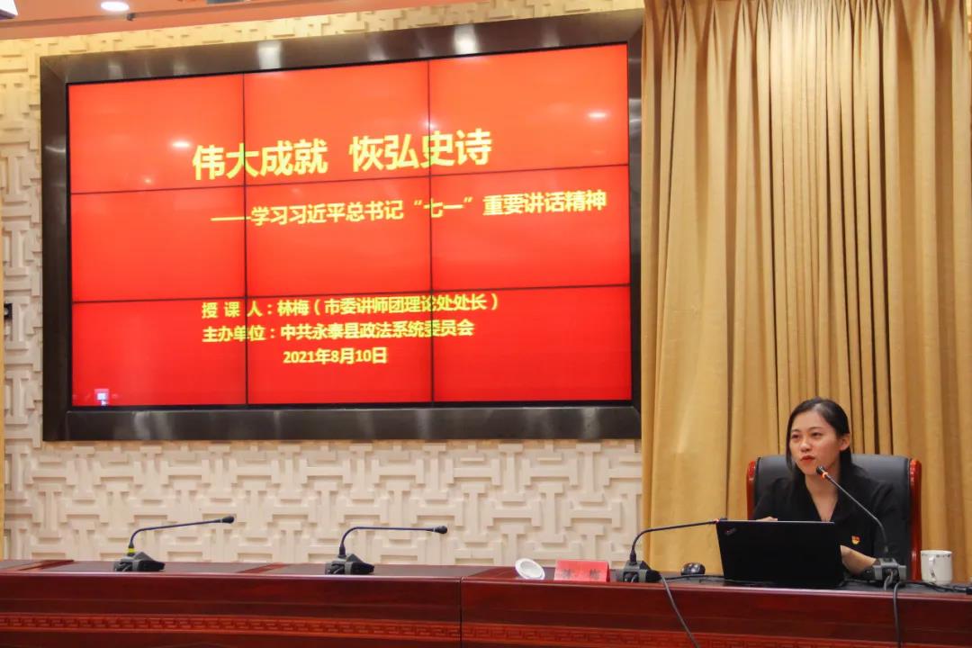 为深入学习贯彻习近平总书记“七一”重要讲话精神,推动党史学习教育走深走实,8月10日上午,永泰县政法系统党委举办学习贯彻习近平总书记“七一”重要讲话精神专题宣讲会,福州市委讲师团理论处处长林梅作宣讲报告。专题宣讲会由县政法系统党委书记陈丰主持,县委政法委机关党支部全体党员、各乡镇政法委员以及县政法系统党委各党(总)支部书记、委员约70余人参加。
