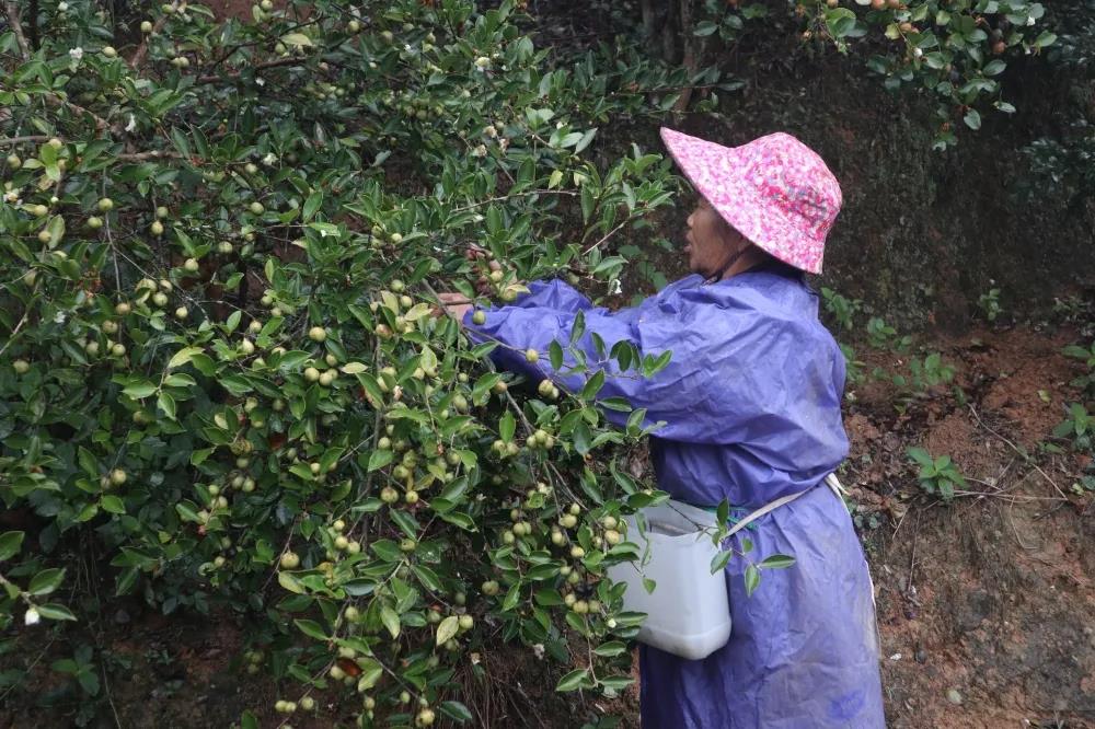 “霜降”前后是我县油茶籽采摘的最佳时机。在红星乡雁门村的油茶山上,已是一派丰收景象。漫山遍野的油茶树郁郁葱葱,枝头上挂满了油茶果个头圆润饱满,表面光亮,村民们正冒着细雨在林间采摘。据了解,这片山头种植有30多亩的油茶树品种为“龙眼茶”,别看它果小,但是果皮却很薄,出油率高、油质好。油茶采摘的季节性非常强,“霜降”前后油茶果的油脂含量达到最高,油的品质也最好。因此,连日来村民们都在山上忙碌着,抢抓在立冬之前将油茶果采摘完毕。从种植到养护整个过程雁门村都遵循着有机、生态的理念。除了施用有机肥外,平时村民会定期剪枝,将油茶树的高度控制在两米以内,以改善油茶林通风透光条件,减少病虫害的发生。