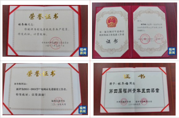 林冬梅(前排中)带领学生参加春运志愿服务 林冬梅通过福州市中小学教师招聘考试,进入福州第十八中学工作。在工作中,她珍惜岗位,勤勉尽责,努力在平凡岗位上,做出不平凡的成绩。曾被评为福州市教育系统先进工作者、优秀共产党员、新长征突击手,还获评第四届福州青年五四奖章,成为第十二届全国青联委员。