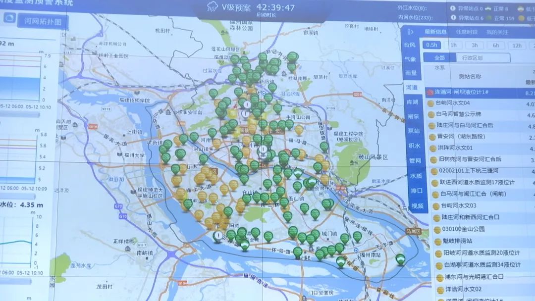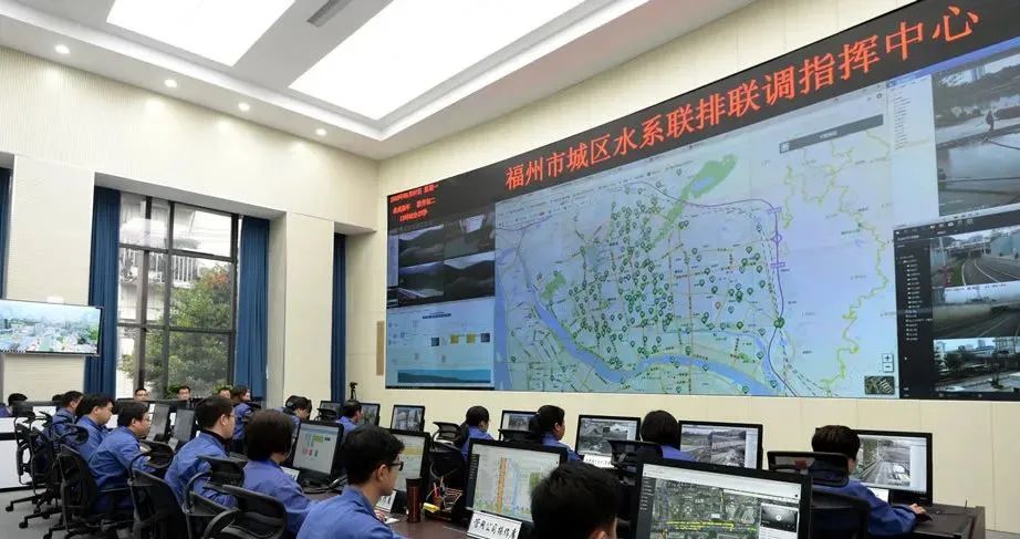 ▲2022年4月27日,水系联排联调中心党员突击队奔赴各区域排水抢险 在积水点现场,应急排水队伍和“龙吸水”等移动排水设备合力奋战;在指挥大厅内,城区排水防涝指挥部各成员单位密切会商,与气象、交警等部门联动配合......在前后方的协同作战下,截至4月27日8时,城区短时积水已基本消退,各主通道和下穿通道均正常通行。 如此高效的应对、处置得益于水系联排联调中心,在机制、软件、队伍、硬件等方面的不断提升,通过机制创新与数字赋能相结合,推进系统治水、统筹治水、智慧治水。 01 “一张图”统排涝 水系联排联调中心整合交通、城管、气象及水务、地铁、在建工地等多方资源,打造排水防涝“一张图作战”系统,实现事前、事中、事后的全过程管控目标。 事前预警预报,提前布防:接到气象部门的暴雨台风信息后,水系联排联调中心第一时间协同水利、气象、水文等部门对情况进行预判,统一调度“库、湖、闸、站”,将水体预腾空,有效应对强降水;同时根据预案提前安排人员、设备,按照“一点一策”布防。 事中辅助决策,统一指挥:在实时掌握雨情、涝情的基础上,根据一线情况进行科学调度,保证突发情况第一时间处理。 事后灾后评估,优化系统:利用信息平台,对每个易涝点的雨情、积水情况、退水情况、应急抢险速度等进行系统分析、总结,为以后的部署、抢险、整治等工作提供参考。 02 “一平台”集智慧 为破解治水中“管网运行缺乏数据、降雨影响事前研判不精准、人工启动水闸排涝反应慢”等难题,在福州打造“全国数字应用第一城”的背景下,2018年4月,水系联排联调中心城区水系科学调度系统建设正式启动。
