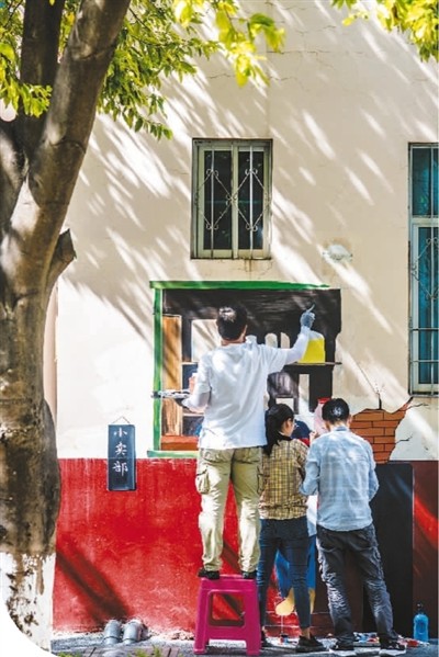 4月28日,云南省玉溪市峨山彝族自治县桂峰小区,人们在老旧小区的墙面上绘制墙画。 新华社记者 胡 超摄