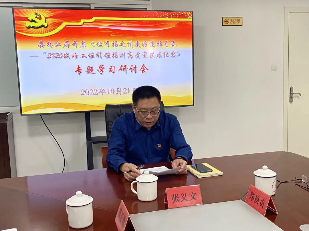 10月21日上午,党组书记、局长张义文同志主持召开理论中心组学习会,围绕新华社通讯文章《让有福之州更好造福于民——“3820”战略工程引领福州高质量发展纪实》开展专题学习研讨。局班子领导,党支部支委成员约20人参与。