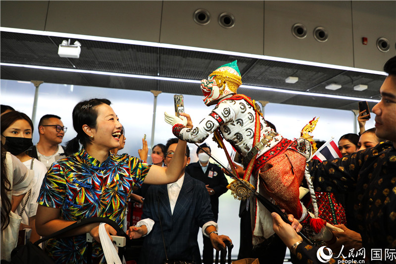 在迎接仪式中,泰国机场工作人员与中国游客友好互动。人民网记者 白元琪摄 |