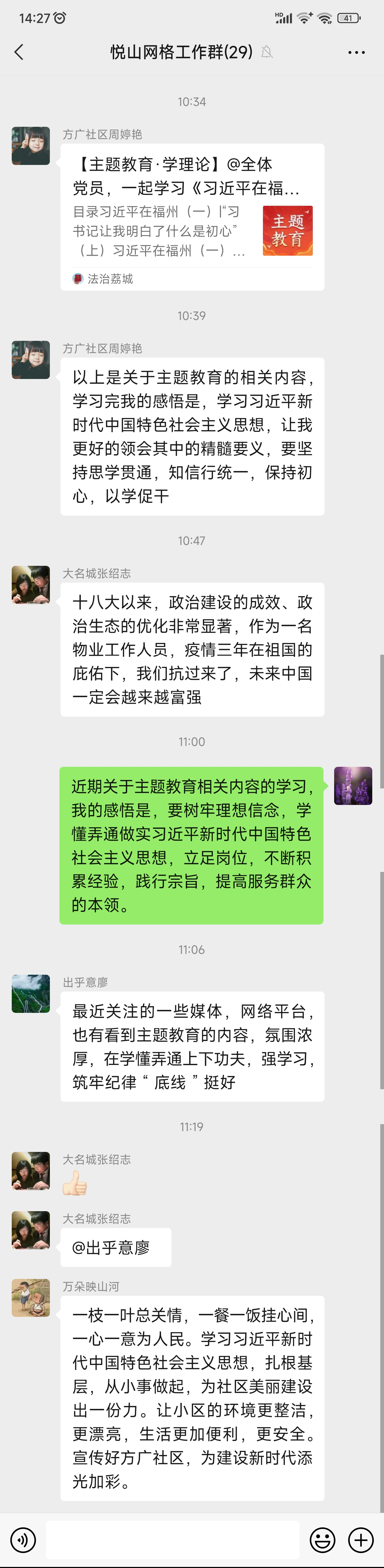 学在网格,让群众“开心” 一大早,葛岭镇方广社区的支部书记周婷艳来到办公室,今天是利用网格微信群开展“新媒体+”主题教育学习的宣讲日。她将学习资料发送至悦山网格工作群里,并分享学习感悟。网格群里的党员、居民学习之后,也纷纷发表学习心得。“学习习近平新时代中国特色社会主义思想,扎根基层,从小事做起,为社区美丽建设出一份力”,大家都表示要通过此次学习,深入学习领会习近平新时代中国特色社会主义思想,为建设美好社区贡献自己的力量。 葛岭镇积极挖掘、整合网格内的党员人才,组建98支“网格课堂”宣讲队,拓宽基层宣讲新路径。宣讲人员时常带着各自片区的网格员们网上送学、走村入户,召开线上学习会、板凳会、院落会等近300场,用深入浅出、通俗易懂的语言为群众宣讲党的光辉历程,进一步提高党员群众参学率,把党的声音及时传播到网格各角落。 永泰县充分发挥网格微信群联系居民群众沟通平台的作用,借力网格微信群覆盖面广、传播率快的优势,在全县共建立1429个网格微信群,定期推送图文音频等学习内容,以具体化、差异化、高效化措施,确保各领域党员学习“不断线、不掉队、不流学”,切实增强主题教育学习效果。