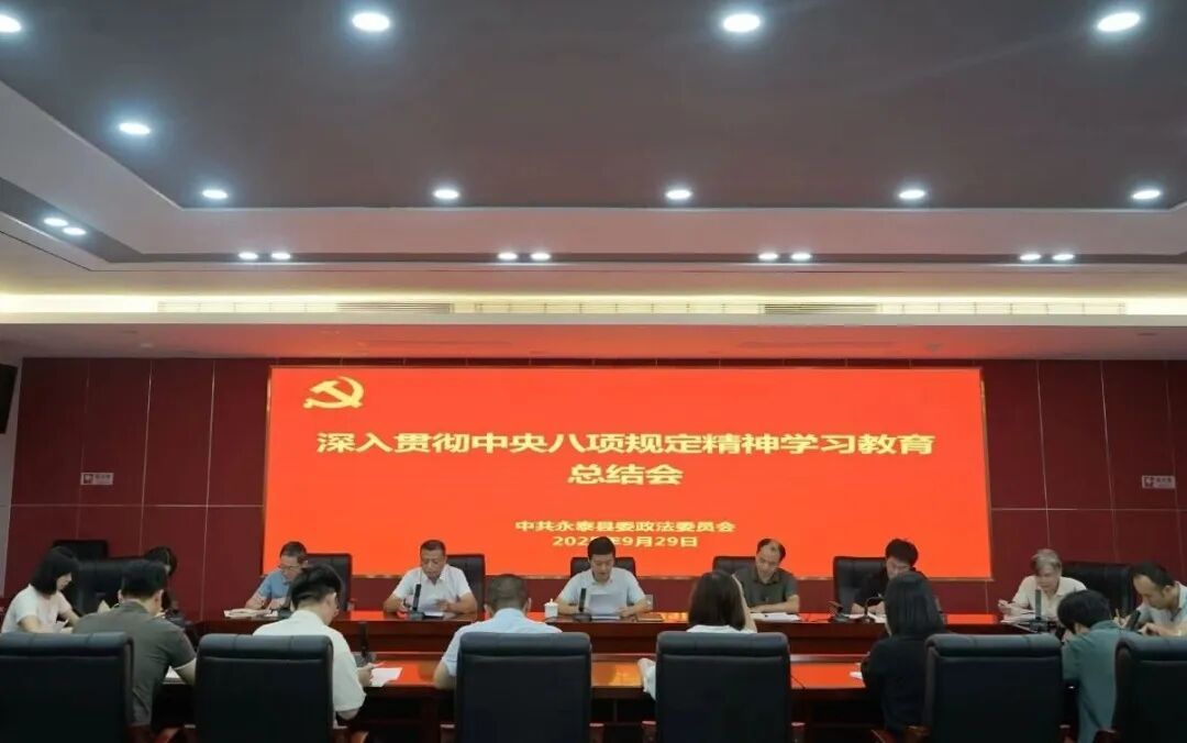 9月29日上午,永泰县委政法委召开深入贯彻中央八项规定精神学习教育总结会,县委常委、政法委书记陈建新主持会议并讲话,委机关全体干部职工参加会议。 会议传达学习了习近平总书记关于深入贯彻中央八项规定精神学习教育的重要指示精神和中央、省委、市委、县委党的建设工作领导小组会议精神,总结回顾了委机关深入贯彻中央八项规定精神学习教育成效,研究部署了巩固拓展学习教育成果、锲而不舍落实中央八项规定精神、推进作风建设常态化长效化工作。