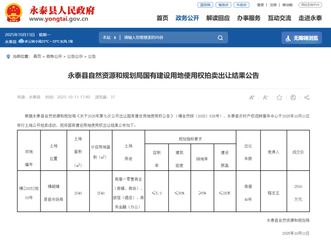 近日 永泰县农村产权流转服务中心 举行土地公开拍卖活动 本次拍卖出让土地1540平方米 成交价款2500万元 具体情况如下 ↓↓ 该地块为旧市场监督管理局地块,今年上半年,永泰县自然资源和规划局在永泰县人民政府网公示了《永泰县旧市场监督管理局地块城市设计及控规要争论证报告》 根据规划,此处将建设一栋7层小高层商业建筑,建筑外观特意设计为与永阳古城相衔接的风格,延续区域历史文化风貌。总建筑面积约9700平方米,计容建筑面积约7700平方米,地下建筑面积约1728平方米平方米,配建30个地下机动车停车泊位,容积率5.0,建筑密度80%,绿地率5%,建筑高度为28米,建筑总高度为31.5米。 |