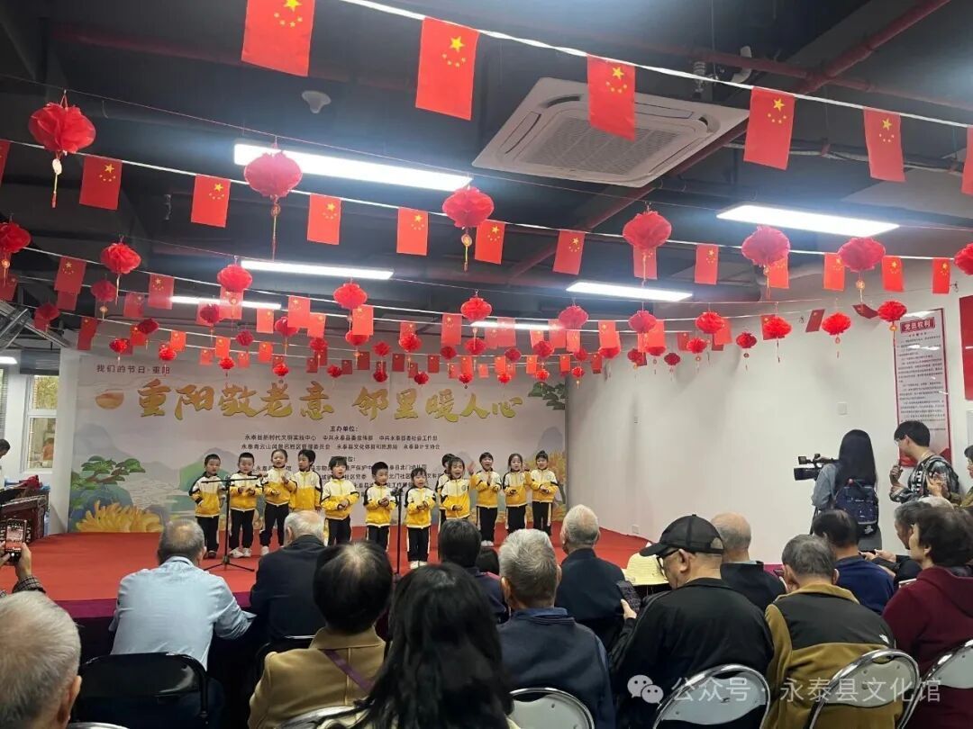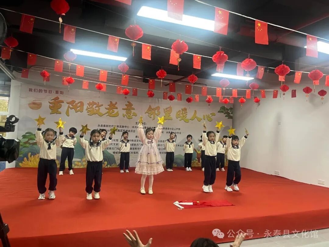 活动现场热闹非凡,文艺演出率先点燃氛围。永泰县北门幼儿园的小朋友们成为舞台上最亮眼的“小主角”:童谣《重阳乐》天真烂漫,稚嫩歌声瞬间拉近与老年观众的距离;红歌合唱《党是太阳我是花》以清澈童声传递爱党情怀;红歌表演《红红的太阳》中,孩子们身着鲜艳服装,伴着欢快旋律起舞,可爱模样让台下老人们频频点头,脸上满是欣慰笑容。随后,山歌快板《讲中央八项规定》用接地气的表演传递政策精神,笛子独奏悠扬婉转;男声独唱《我爱你中国》、女声独唱搭配民乐伴奏《泉水叮咚响》轮番登场,太极功夫扇刚柔并济。紧接着,一曲民乐合奏《江南春早》 奏响,明快旋律让人仿佛置身春日江南,赢得台下阵阵喝彩;最后,民乐伴奏的红歌小组唱温情收尾,熟悉的红色旋律搭配悠扬民乐,引得台下老人轻声跟和,不少人还跟着节奏轻轻拍手,演出在温馨合唱与热烈掌声中圆满落幕。