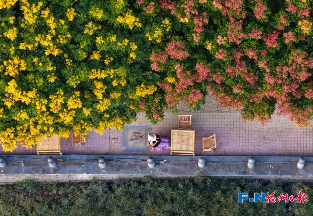 而在这片醉人蓝天的映衬下,愈发显出福州那一抹独特的“榕城绿”。当北国万物开始敛藏,榕城的生命依然从容舒展,绿得坦然,也绿得蓬勃。古榕垂须,垂柳摇风,街巷间静立着的行道树……它们以层层叠叠的绿意,轻轻托住冬日的暖阳,也接住行人闲适的脚步与流连的目光。 绿意之外,11月的福州更悄然铺展出一场色彩的盛宴:西湖公园里秋菊绽放出斑斓的画卷,闽江公园北园栾树缀满温柔的粉红,乌龙江湿地中橘红色的水杉与飘香的桂花交织,赤桥公园里粉黛草与异木棉晕染出梦幻的粉霞……整座城市仿佛一只被打翻的调色盘,在绿的底色上,点缀出处处皆景的诗意。