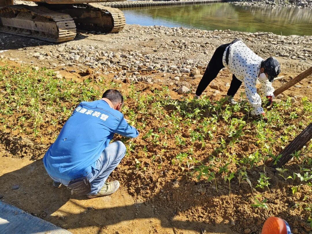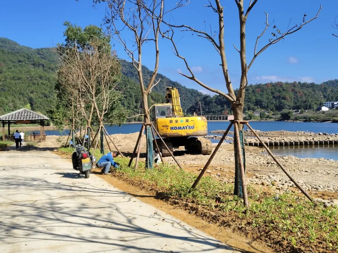 另一边 在村子西北侧大喜水库旁的河道沿岸 工人们正忙着进行道路的绿化收尾工作 一条兼具防洪与观光功能的 防洪巡河步道已初具雏形