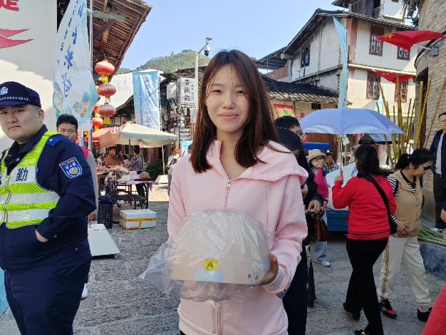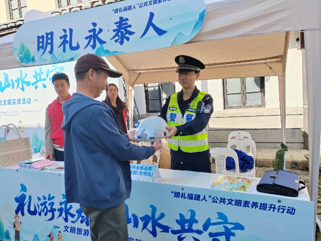 此外,现场设置的交警宣传点,为市民游客发放交通安全宣传册和安全头盔,提醒大家出行途中既要文明观景,也要注意安全防护。