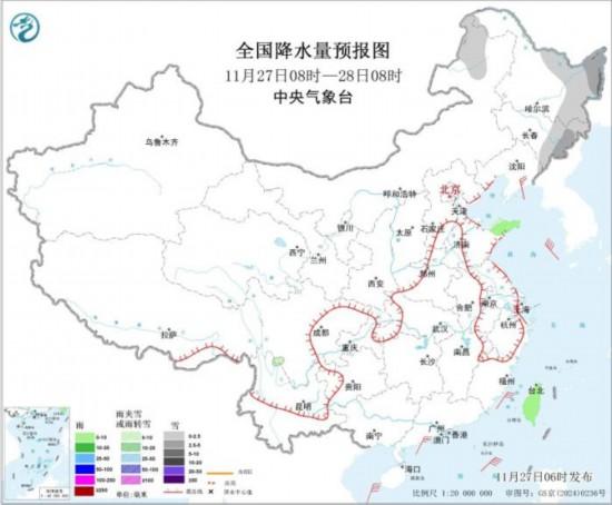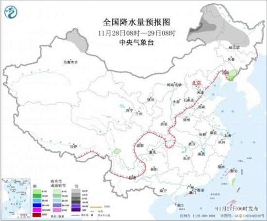 全国降水量预报图(11月27日08时-28日08时) 11月28日08时至29日08时,内蒙古东部、黑龙江中西部、新疆北疆北部等地部分地区有小雪或雨夹雪,其中,内蒙古东北部等地部分地区有中到大雪;内蒙古大部有4~6级风,阵风8~9级;南海西南部海域将有8~9级、阵风10级的偏北到西北风,南海中部和东北部海域将有6~8级、阵风9级的东北风。