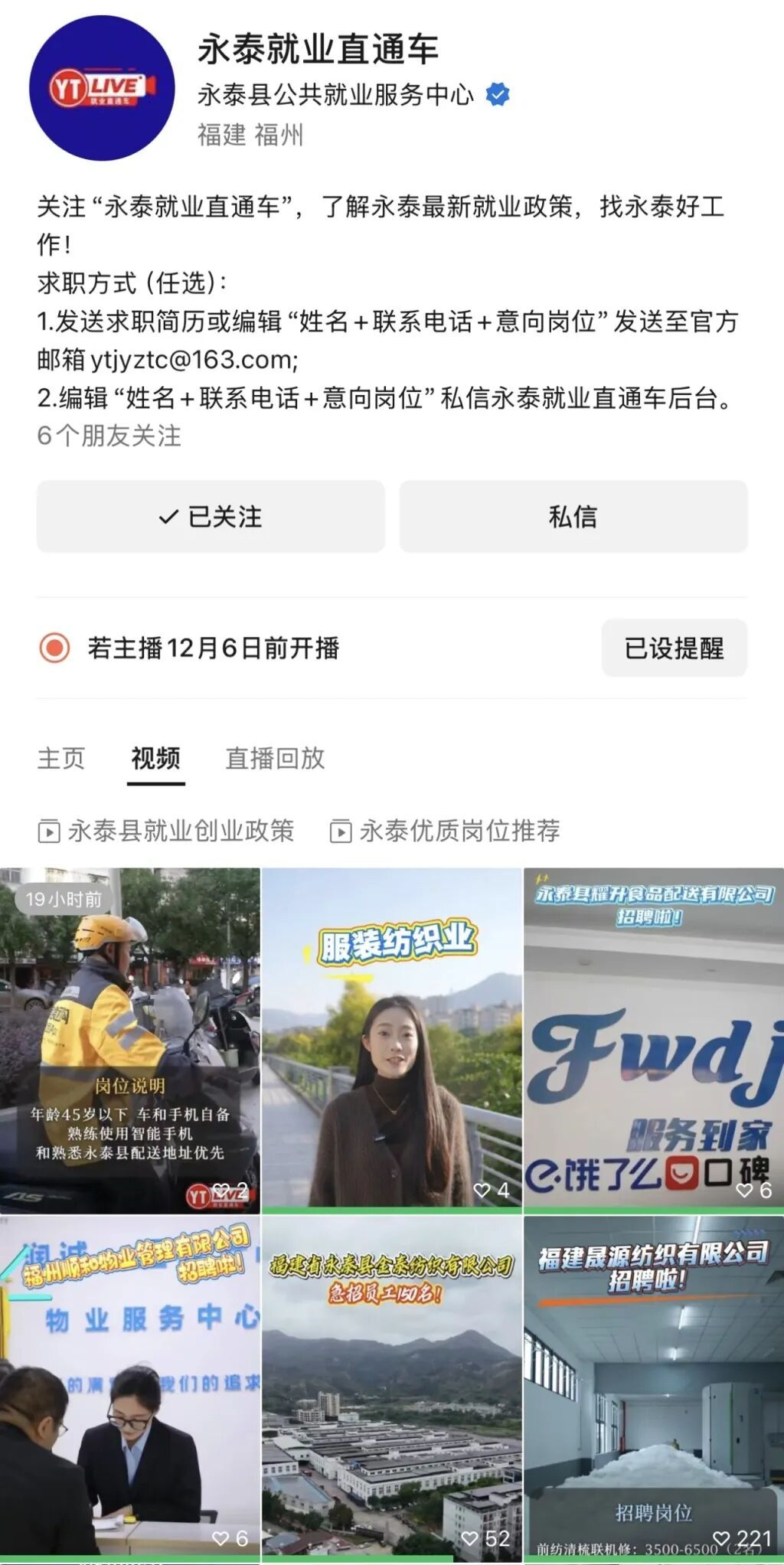 “建筑行业专场有没有施工员岗位?” “旅游酒店企业的薪资范围是多少?” 针对不同群体的就业需求和本地产业特色 “永泰就业直通车” 还创新推出行业专场直播模式 围绕农文旅、建筑、绿色产业、服装纺织、 福州市重点用工企业五大板块 开展精准化岗位推送 有效提升人岗匹配效率 除了直播带岗 平台还同步运营 视频号、抖音号等新媒体矩阵 通过拍摄“入企探岗”短视频 真实展示企业工作环境 让求职者实现“沉浸式”择岗 同时 定期发布“就业政策解读”短视频 让求职者随时随地了解 最新就业资讯和政策红利