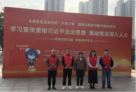 为深入学习宣传贯彻习近平法治思想,大力弘扬宪法精神与志愿服务精神,在第十二个国家宪法日及第四十个“12·5”国际志愿者日来临之际,12月4日上午,永泰县委宣传部、县委社会工作部、县委政法委、县委依法治县办、县司法局、永泰县移动公司等多部门联合在城峰镇立塘社区,举办宪法宣传周·平安三率·国际志愿者日集中宣传活动,以多元形式推动法治文化与志愿精神走进基层、融入民心。