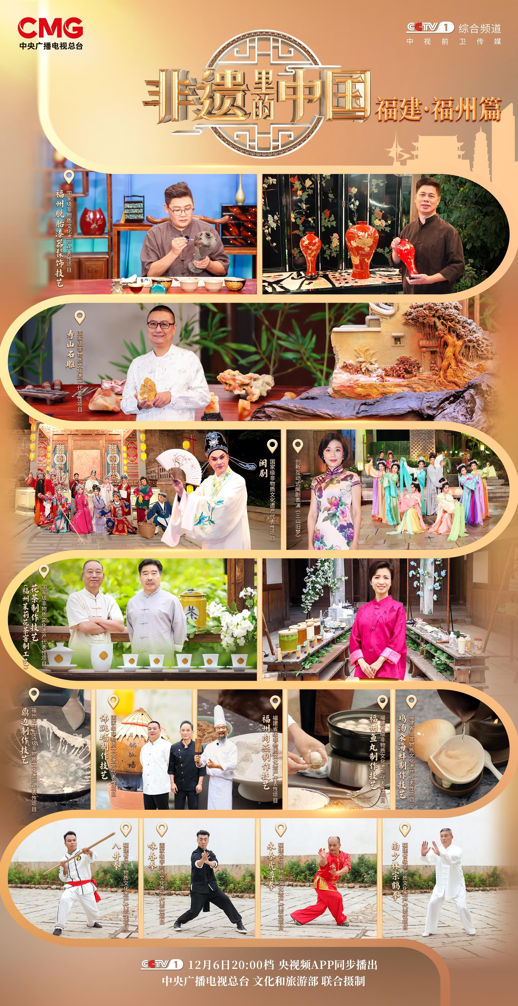 山海福地,有福之州。福州,这片浸润着千年闽都文脉的山海福地,孕育着非遗技艺的代代传承与生生不息。在这里,匠人以精工细作守护传统,市井生活中亦处处彰显雅俗共赏的民间智慧。福州市共有国家级非物质文化遗产代表性项目16项、省级非物质文化遗产代表性项目94项、市级非物质文化遗产代表性项目249项,其中有2项列入联合国教科文组织非物质文化遗产代表作名录。 由中央广播电视总台与文化和旅游部联合摄制的大型文化节目《非遗里的中国》福建·福州篇将于12月6日20:00档在总台综合频道(CCTV-1)播出,央视频全网独家首播。