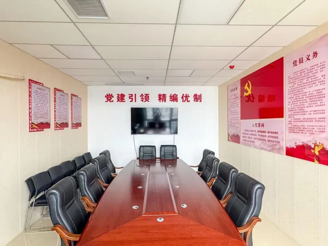 会议室墙上挂着党旗、入党誓词、党员义务、党员权利、“三会一课”相关要求以及“党建引领 精编优制”标识,简洁大方。
