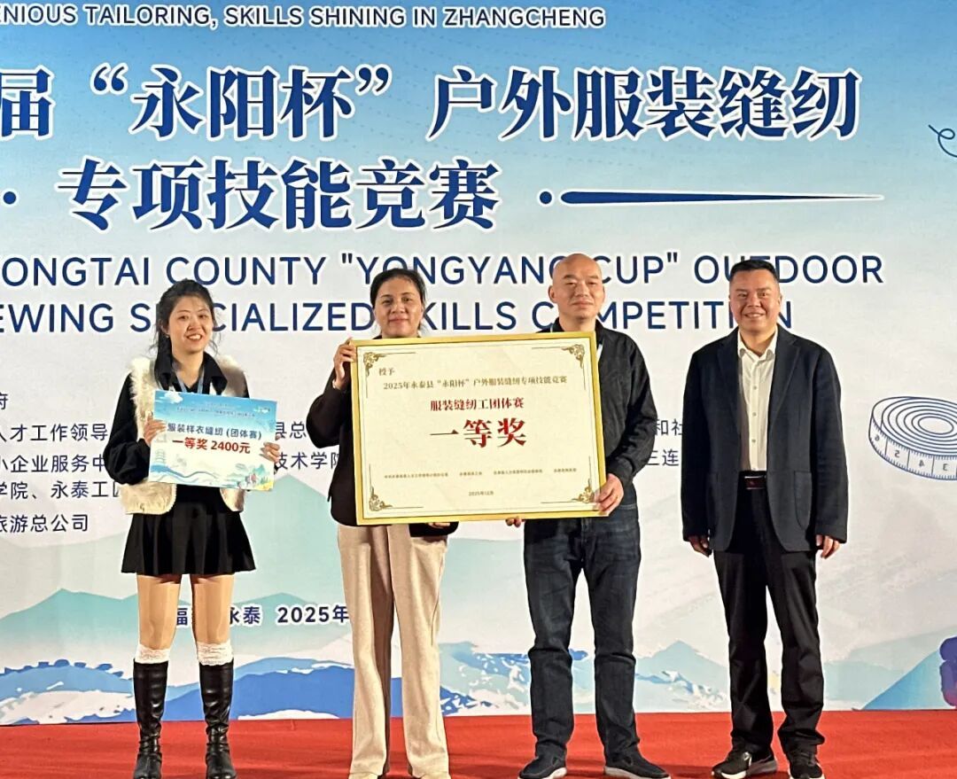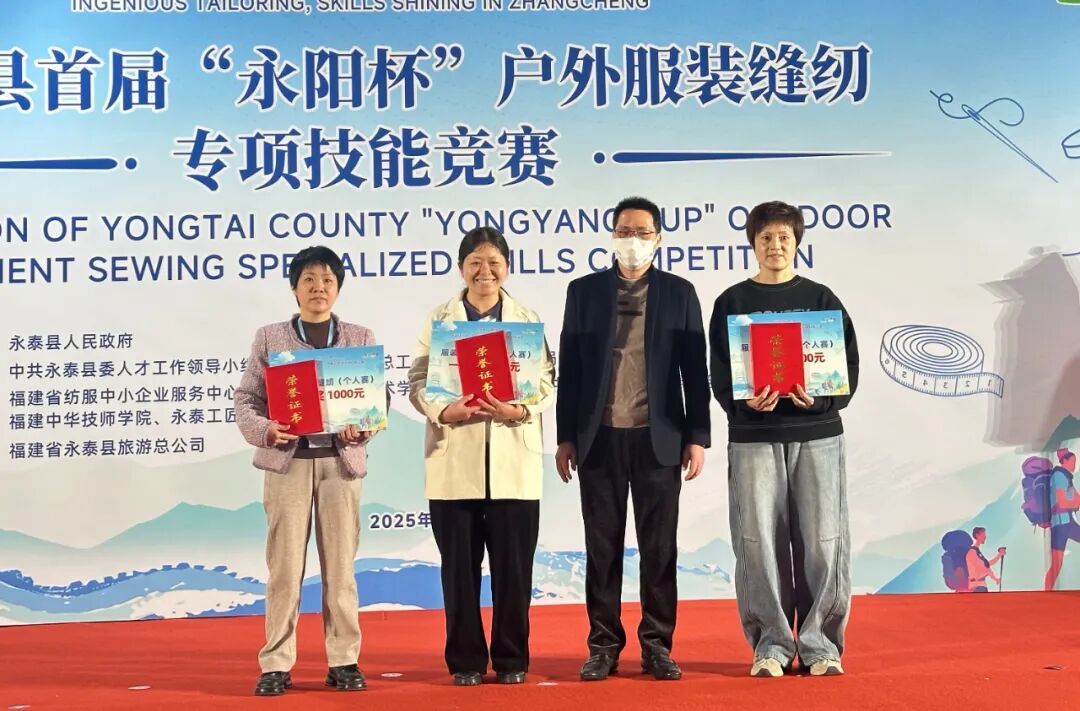 经过多轮激烈角逐 各赛道奖项逐一揭晓 其中 吴登琴、程永华、陈丽芳 斩获“服装部件缝纫”项目一等奖 福建省永泰叁连服饰有限公司 张标栋、林美琴、陈秀芳 凭借出色的协作表现 摘得“服装样衣缝纫”团体赛桂冠 在技术含量最高的“冲锋衣整衣制作”赛项中 选手王云亮 凭借精湛技艺脱颖而出 荣获“巧匠能手”金奖 “巧匠能手”金奖获奖人 王云亮: “这份奖项是对我多年专注缝纫技艺的肯定,更是一种激励。我将把比赛中学到的新技巧、新标准带回工作岗位,带动身边工友共同提升技能,用自己的‘针线功夫’为永泰户外服装的优质口碑添砖加瓦。”