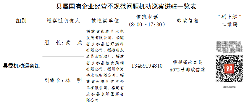 按照县委统一部署,近日,县属国有企业经营不规范问题机动巡察完成进驻工作,对福建省永泰县水电发展有限公司、福建省永泰县亿好燃料有限公司、福建省永泰县加饭酒厂、福建省永泰县粮食购销有限公司、福州市海峡水业有限公司、福建省永泰县亿丰食品有限公司、福建省永泰县永阳医药有限公司等7家企业开展机动巡察。 巡察工作时间30天左右。其间,设立专门值班电话和邮政信箱,主要受理反映被巡察单位管理人员问题的来信来电来访,重点是关于违反政治纪律、组织纪律、廉洁纪律、群众纪律、工作纪律、生活纪律等方面问题反映。其他不属于巡察受理范围的信访问题,将按规定转有关部门处置。