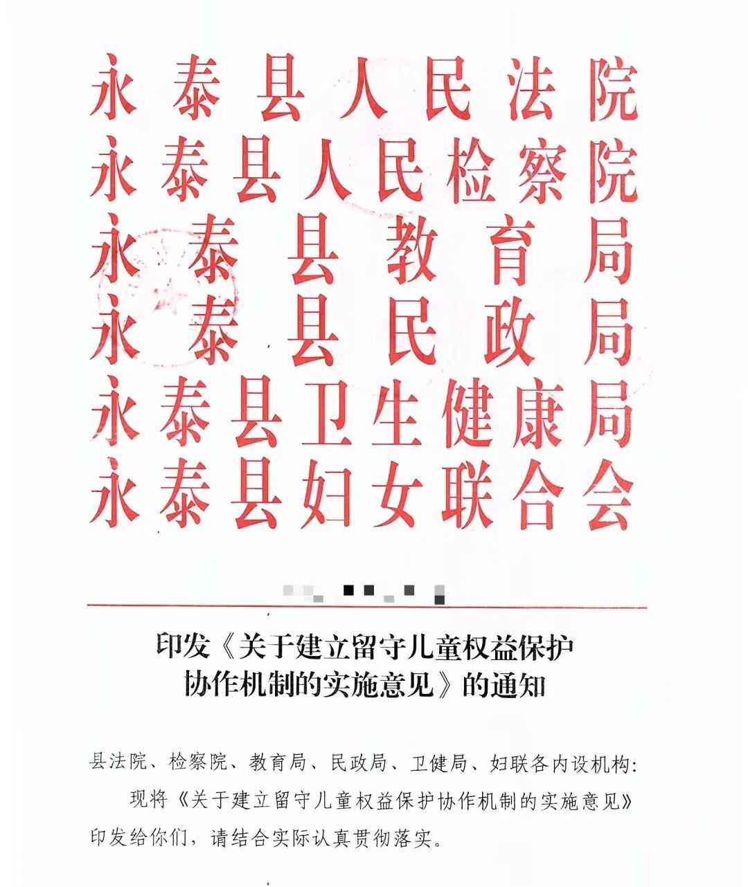 健全协作机制,凝聚保护合力。联合县法院、教育局、民政局、卫健局、妇联等五部门会签《关于建立留守儿童权益保护协作机制的实施意见》,创新构建“司法保护+行政保障+社会服务”三位一体保护体系,打破部门壁垒,实现信息共享、责任共担、工作联动,推动留守儿童保护从“分散发力”向“协同共治”转型。
