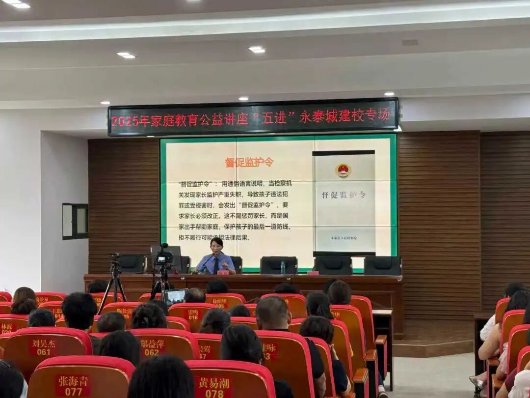 融入专业力量,提升指导专业性。选派经验丰富的检察官加入县家庭教育讲师团,深度参与省级“家庭教育公益讲座五进项目”,结合未成年人犯罪、权益受侵害等典型案例,向家长普及监护职责、家庭保护法律规定及思想道德教育方法,引导家长树立“依法带娃”理念,强化对未成年子女的陪伴与正向引导。