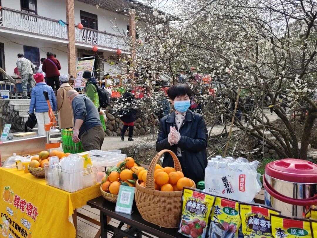 赏梅热潮带动周边经济同步升温 梅园外围 村民们摆起的摊位上 李干、葱饼、青梅酒等永泰特色美食琳琅满目 露天农家乐里 现煮的鱼丸、蛋燕热气腾腾 备受游客青睐