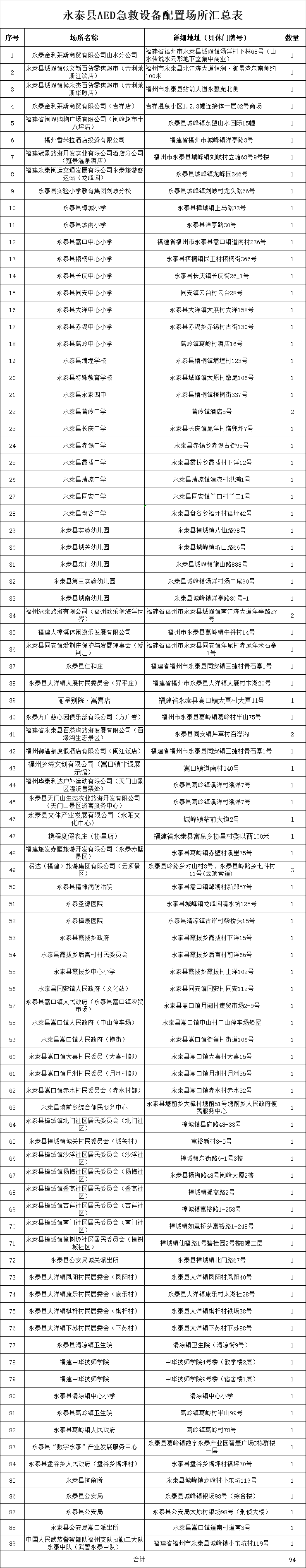 为织密全县公共卫生应急保障网 筑牢群众生命安全防线 近日 永泰县卫健局联合相关部门完成了 94台自动体外除颤仪(AED)的安装与调试 此次AED设备投放覆盖政务服务中心、学校、医院、车站、大型商超、景区等人员密集场所。每台设备均配备清晰的指引标识与操作说明,方便群众快速识别、及时取用。 AED又被称为“救命神器”。它可以自动分析患者心律,在必要时电击除颤,帮助心脏骤停患者恢复心跳,为抢救赢得“黄金4分钟”。与专业急救设备不同,AED操作简单易懂,非专业人员经过简单培训即可使用,能极大提升公共场所突发心脏骤停事件的抢救成功率。 生命至上,守护同行。下一步,永泰县卫健局将联合县红十字会等部门持续开展AED使用和心肺复苏(CPR)技能培训,让更多群众成为“急救员”,共同守护身边人的生命安全。 以下为AED设备具体位置 请大家收藏 (图片可点击放大观看)