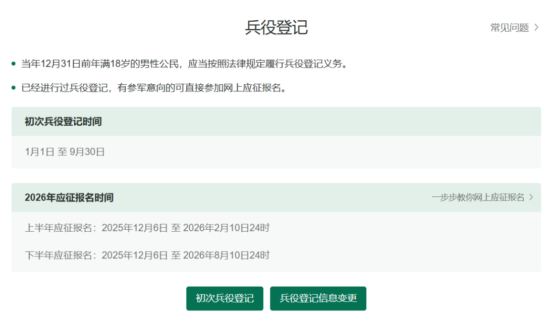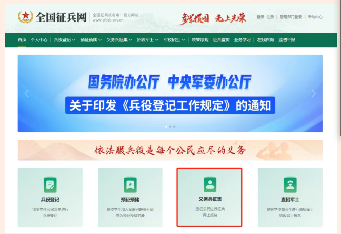 四、网上应征报名步骤 (男兵报名步骤) ①开始。2026年全国征兵网网上登记报名于2025年12月6日开始。全国广大适龄男青年可登录全国征兵网进行兵役登记和应征报名,之后根据兵役机关安排进行实地初检初核。 在全国征兵网首页,点击“ 兵役登记 ”;