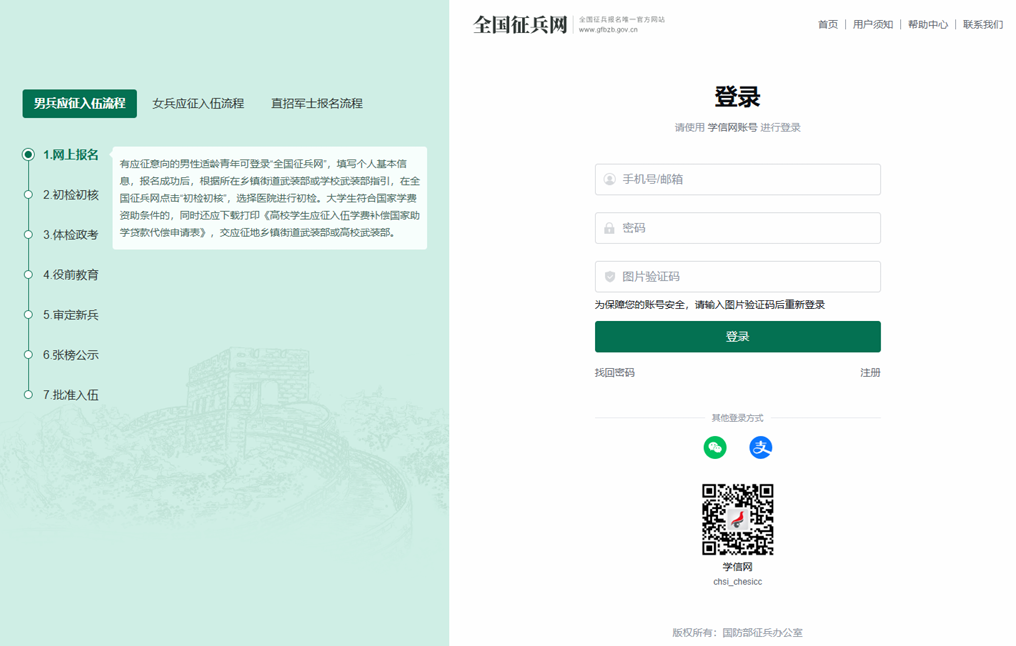 在这个页面中,会告知我们报名时间以及参军的政策说明,建议看后,点击“ 初次兵役登记 ”,迈出你军旅生涯的第一步! ②登入系统。点击之后将会进入新的页面要求登录,没有注册过账号的小伙伴,只需要在页面上点击“注册”按钮去注册一个学信网账号后进行登录就行了。