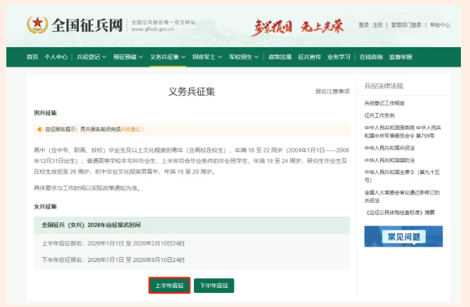 2026年应征入伍报名指南 一、应征报名时间 男兵: 上半年:2025年12月6日至2026年2月10日24时 下半年:2025年12月6日至2026年8月10日24时 女兵: 上半年:2026年1月1日 至 2026年2月10日24时 下半年:2026年7月1日 至 2026年8月10日24时 二、应征对象 男兵: 高中(含中专、职高、技校)毕业生及以上文化程度的青年(含高校在校生),年满 18 至 22 周岁(2004年1月1日——2008年12月31日出生);普通高等学校本专科毕业生、上半年符合毕业条件的毕业班学生,年满 18 至 24 周岁;研究生毕业生及在校生放宽至 26 周岁。 女兵: 上半年应征报名:普通高等学校和科研机构全日制应届毕业生及在校生,年满18至22周岁(2004年1月1日——2008年12月31日出生),全日制研究生应届毕业生及在校生放宽至26周岁;普通高等学校全日制本专科往届毕业生可以报名参加2026年上半年女兵征集,年龄放宽至23周岁。 下半年应征报名:普通高中应届毕业生、普通高等学校和科研机构全日制应届毕业生及在校生,年满18至22周岁(2004年1月1日——2008年12月31日出生),全日制研究生应届毕业生及在校生放宽至26周岁。 三、体检基本要求 (1)身高体重 男性:身高160cm以上,合格。条件兵身高条件按有关标准执行。体重符合下列条件且空腹血糖<7.0mmol/L的,合格。17.5≤BMI<30,其中:17.5≤男性身体条件兵BMI<27;BMI≥28须加查血液糖化血红蛋白检查项目,糖化血红蛋白百分比<6.5%,合格。(BMI=体重(千克)除以身高(米)的平方)。 女性:女性身高158cm以上,合格。条件兵身高条件按有关标准执行。体重符合下列条件且空腹血糖<7.0mmol/L的,合格。17≤BMI<24。BMI≥28须加查血液糖化血红蛋白检查项目,糖化血红蛋白百分比<6.5%,合格。 (2)视力 任何一眼裸眼视力低于4.5不合格。任何一眼裸眼视力低于4.8,需进行矫正视力检查,任何一眼矫正视力低于4.8或矫正度数超过600度,不合格。屈光不正经准分子激光手术(不含有晶体眼人工晶体植入术等其他术式)后半年以上,无并发症,任何一眼裸眼视力达到4.8,眼底检查正常,除条件兵外合格。条件兵视力合格条件按有关标准执行。 (3)文身 面颈部文身,着军队制式体能训练服其他裸露部位长径超过3cm的文身,其他部位长径超过10cm的文身,男性文眉、文眼线、文唇,女性文唇,不合格。 (4)口腔 深度龋齿超过3个,缺齿超过2个(经正畸治疗拔除、牙列整齐的除外),全口义齿及复杂的可摘局部义齿,重度牙周炎,影响咀嚼及发音功能的口腔疾病,颞颌关节疾病,唇、腭裂及唇裂术后明显瘢痕,不合格。经治疗、修复后功能良好的龋齿、缺齿,合格。