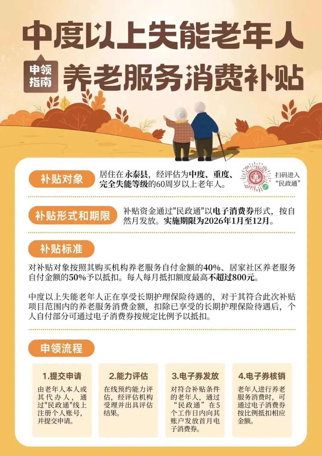 下面就用大白话跟大家说清楚 谁能领、怎么领、怎么用 领多久?明确实施期限 实施时间:2026年1月至12月 谁能领?明确补贴对象 得同时满足这几个条件: 1.居住在永泰县,年龄满60周岁及以上; 2.正在享受居家社区养老服务,或者正在养老机构接受服务; 3.经民政部门认可的专业机构评估后,属于中度、重度或完全失能的老人。 这些情况不能领: 1.没享受过机构养老服务,也没享受过居家社区养老服务; 2.正在领特困人员供养救助待遇; 3.已经拿到经济困难失能老年人集中照护服务补助; 4.正在享受居家和社区基本养老服务提升行动项目服务(比如家庭养老床位服务)。 怎么用?消费方便抵扣 补贴项目: ①居家社区养老服务:主要包括助餐、助浴、助洁、助行、助急、助医服务,以及康复护理、日间托养等服务。 ②机构养老服务:包括长期服务(入住机构时间在30天以上)和短期服务(即"喘息服务",入住机构时间在30天以内)等。 领多少?补贴标准清晰 1. 发放形式 补贴不是发现金,而是通过“民政通”(可以用小程序或 APP)发电子消费券,每个自然月发一次。 2. 补贴标准 养老服务消费券:买居家社区养老服务,能抵扣50%的费用;买机构养老服务,能抵扣40%的费用。不管哪种,每人每月最多抵扣800元。 能力评估消费券:只要评估结果是中度及以上失能,就能领一张100元的券,专门用来抵扣评估费。 3. 关键福利:能和长护险叠加用! 如果老人已经在享受长期护理保险,先走长护险报销,剩下自己要付的钱,还能再用这份电子消费券按比例抵扣。 举个例子:老人入住养老机构自己要付2000元,长护险报销后还剩1000元,用消费券抵扣40%,最后实际只需要付600元,太划算啦! 4. 消费券使用规则 当月领的券当月必须用,过了当月就失效; 不能取现金、不能套现,也不能攒着几个月一起用; 领券的时候,要选微信、支付宝、云闪付其中一种支付方式,当月只能用选好的这种方式付款。 怎么领?学会轻松申领 1.提交申请 要么老人自己来,要么找代办人(比如配偶、子女、亲戚,或者村 / 社区工作人员、养老服务机构工作人员),下载“民政通”APP,或者在微信 / 支付宝上搜“民政通”小程序,注册个人账号后,直接线上提交申请。 2.做能力评估 申请后在线预约能力评估,评估机构受理后,会在5个工作日内完成评估,给出评估结果。 3.领电子消费券 民政部门审核通过后,会通过“民政通”把电子消费券发到老人的账户里,首月券会在5个工作日内发放。领券时,需在微信、支付宝、云闪付中选择一种支付渠道,并且当月只能使用此支付渠道进行支付。 4.用券消费 老人进行养老服务消费的时候,直接用“民政通”里的电子消费券,就可以按比例抵扣费用啦。 如何找到民政通 1.微信 / 支付宝搜 “民政通” 小程序,直接进入;