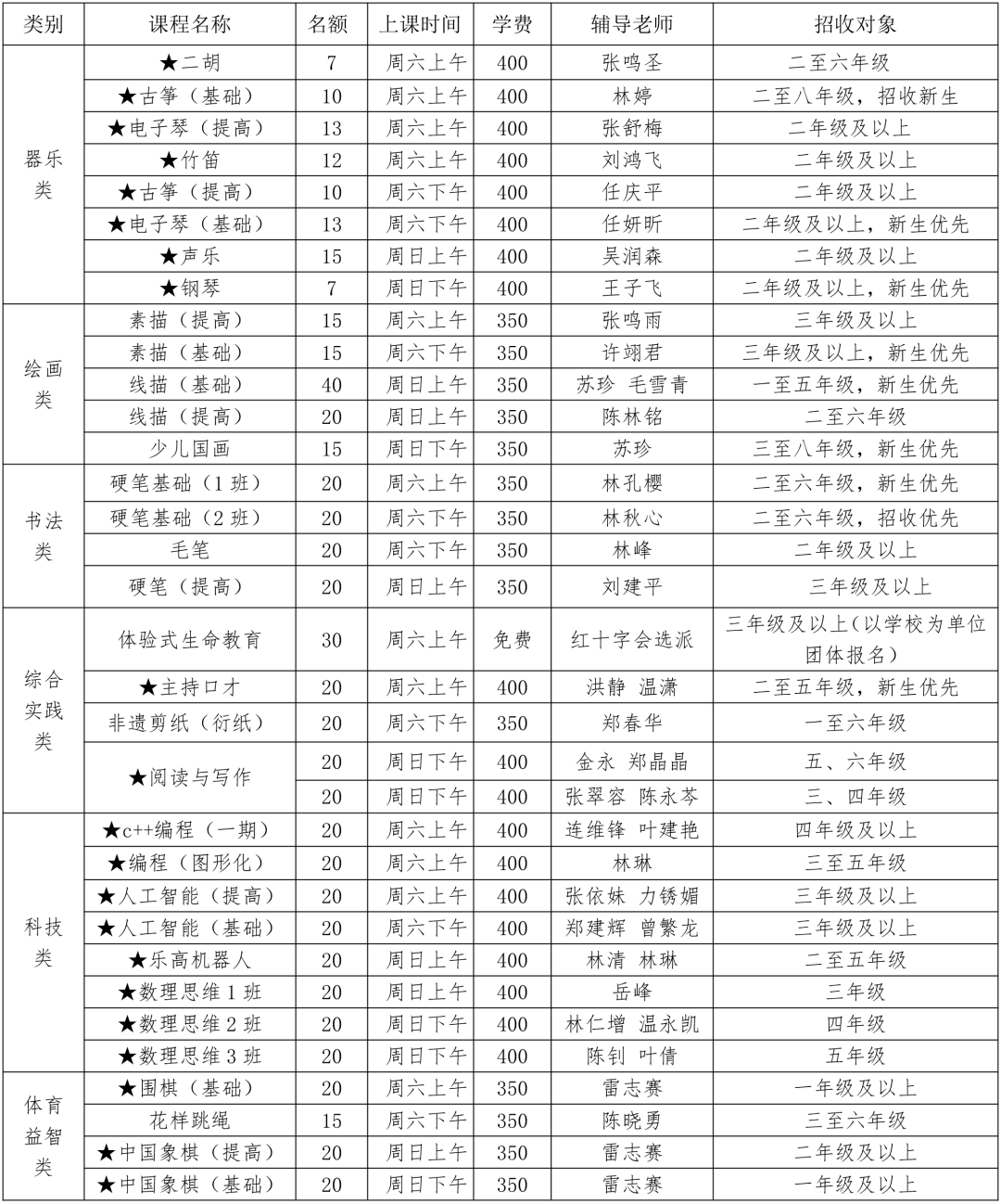 (二)注意事项 1.课程名称前面标记★的需面试(或测试),报名时家长需携带学员本人到现场参加面试(数理思维班测试定在2月1日下午3点,测试地点在活动中心一、二层教室),“数理思维”授课内容分别为相应年级的数学思维强化训练方向;“招收新生”指招收未参加过本年级同类培训班的学员。 2.永泰县红十字生命教育体验公益学堂为2023年度福州市学雷锋志愿服务“五个最美”20个“最佳志愿服务项目”,“体验式生命教育”课程为公益课,与永泰县红十字会联合办学,实行免费培训教学,每期四次,开设心肺复苏及实践操作、创伤包扎及实践操作、常见急症的处理及避险逃生、模拟场景演练等四门课程,每期招收30人,可以由家长与学员组合。授课教师由县红十字会聘任,原则上每10-15名学员安排1名辅导老师。“体验式生命教育”公益课以学校为单位组团报名参训。2026年春季班第一期学员由永泰县实验小学负责组织招募。 3.为深化拓展“公共文化服务校园行”工作,活动中心“阅读与写作”班与县图书馆,书画类班与县文化馆,“非遗剪纸(衍纸)”班与县博物馆,科技教育类班与县科协、县科技馆等单位合作共建办学(科技教育类班依托县科技郑建辉名师工作室名师教学)。 04其他要求 (一)活动中心举办的各类培训班均为公益性普惠活动,向永泰县在校义务教育阶段学生开放(本期不招收幼儿园学员)。 (二)家长在报名前务必根据孩子的兴趣、爱好,自愿、慎重选择所学课程,仔细核对报名条件(特别是年级和基础要求),切勿强迫孩子参训。 1.课程表中招生对象为现有阶段学生所在年级,请勿跨年级报名,以免跟不上课程。凡被录取后随意放弃者,将被活动中心列入黑名单,限制今后报名。 2.每个学员限报两个项目(不含“体验式生命教育”课程),多报或者不符条件乱抢名额者,所交费用将不予退还,并将列入黑名单,今后培训将受限制。如因误报而产生的“无法适应教学”或“时间冲突”等责任由家长自行承担,活动中心有权不予办理换班手续。如私下将所报课程转让他人,一经发现,双方以后都将无法参报活动中心所有课程。报名人数较少的班级,活动中心将重新调整合并;报名成功后不调班、不顶班、不退费。因自身原因请假、旷课等原因缺课,本中心不予以补课,请家长报名前慎重考虑。 (三)低保特困户如报名成功,可凭以下证明材料免费参加非乐器类培训活动。有关证明材料:【1必备,2、3选一即可】 1.户口本户主及子女页原件及其复印件。 2.接收低保补助的银行账户近六个月流水明细。 3.县民政局低保证明。 (四)家长要做好学员接送工作,学员及家长应全程注意安全。接送车辆一律停靠在永泰一中校外停车位内,凭学员出入卡按指定路线(往田径场与一中教学楼之间的水泥路)将孩子送达活动中心一层大厅(家长必须在规定培训时段前后20分钟内按时接送子女)。具体时间如下: