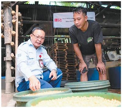 威利(左)对曼迪斯村豆腐作坊进行现场指导。