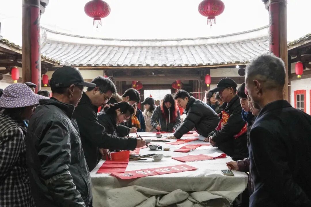 工作坊结束后 活动进一步从课堂延伸至社区生活 开展乡村社区写春联送祝福活动 来自福州市及永泰县的书法老师走进村庄 现场挥毫泼墨 为乡亲们书写寓意吉祥的新春春联 一副副红纸黑字铺满案台,墨香四溢 吸引不少村民驻足观看、排队领取 现场洋溢着浓浓年味