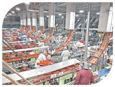 在智利一处车厘子包装车间内,工人们忙碌于流水线旁,将刚刚采摘的车厘子逐一分拣、装箱。