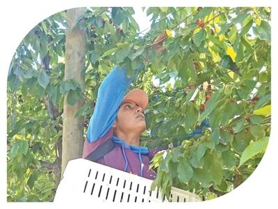 在智利一家农场内,工人正在采摘成熟的车厘子。