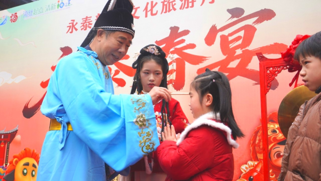 部分图片来源:赖泽樟 除了舌尖上的盛宴 席间的非遗展演与民俗互动 让现场氛围持续升温 嵩口肥狮纳福表演憨态可掬 传递新年吉祥安康的祝福 省级非遗虎尊拳刚劲有力 展现 “武术之乡” 的雄风 永泰山歌婉转悠扬 唱响乡土文脉与人间烟火的温情 “朱砂启智” 环节中 长者为孩童点下朱砂 传承张元干文化中的求学祈福传统