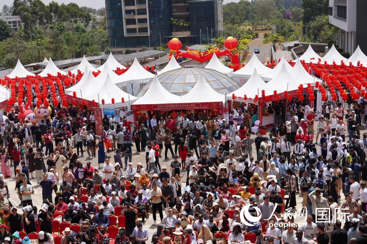 近万名中肯民众参加第三届内罗毕春节庙会。人民网记者 黄炜鑫摄 欣赏中非文化特色演出、体验中国春节习俗、品尝中华美食……由旅肯侨团联合举办的第三届内罗毕春节庙会在双河购物中心举行。现场红灯高挂,人头攒动,处处洋溢着欢乐、喜庆的新春氛围,近万名中肯民众一同逛庙会、品年味。 “我喜欢中国的美食和茶文化。”肯尼亚青年罗宾逊·基梅米亚正在学习中文,他说:“这场中国春节庆祝活动为我们了解中国文化打开了一扇大门。”