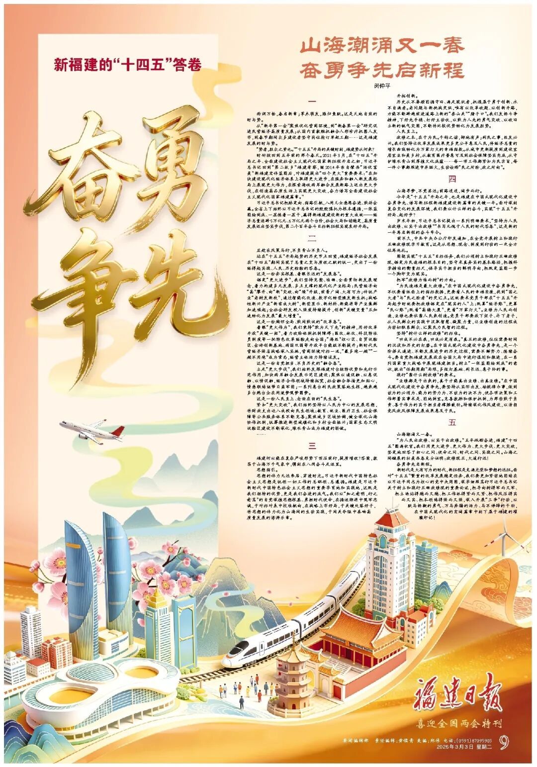 3月3日,福建日报全国两会特刊《奋勇争先——新福建的“十四五”答卷》刊发闵仲平文章《山海潮涌又一春 奋勇争先启新程》。