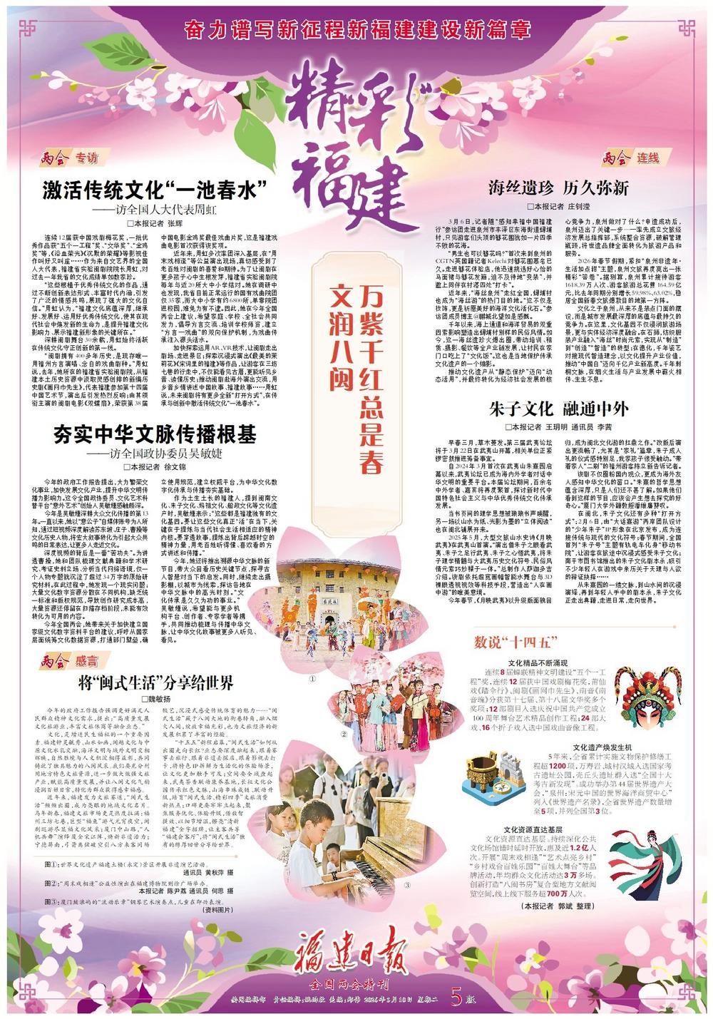 《福建日报》2026年3月10日第05版 文润八闽 万紫千红总是春 两会专访 激活传统文化“一池春水”——访全国人大代表周虹 连续12届获中国戏剧梅花奖,一批优秀作品获“五个一工程”奖、“文华奖”、“金鸡奖”等,《浴血荣光》《沉默的荣耀》等影视佳作叫好又叫座……作为来自文艺界的全国人大代表,福建省实验闽剧院院长周虹,对过去一年我省的文化成绩单如数家珍。 “这些根植于优秀传统文化的作品,通过不断创新表达形式、丰富时代内涵,引发了广泛的情感共鸣,展现了强大的文化自信。”周虹认为,“福建文化底蕴深厚,继承好、发展好、运用好优秀传统文化,使其在现代社会中焕发新的生命力,是提升福建文化影响力、展示福建新形象的关键所在。”详情>>> 夯实中华文脉传播根基——访全国政协委员吴敏婕 今年的政府工作报告提出,大力繁荣文化事业,加快发展文化产业,提升中华文明传播力影响力。这令全国政协委员、文化艺术科普平台“意外艺术”创始人吴敏婕感触颇深。 今年是吴敏婕深耕大众文化传播的第13年。一直以来,她以“意公子”自媒体账号为人所知,通过短视频深度解读苏东坡、庄子、曹操等文化历史人物,将宏大叙事转化为引起大众共鸣的日常表达,让更多人走近文化。详情>>>